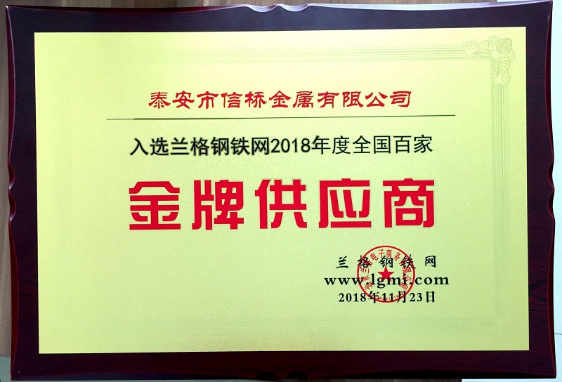 會議過后后,是眾多鋼企,鋼貿商期待的頒獎環(huán)節(jié),泰安市信橋金屬有限公司再獲殊榮,榮獲蘭格網“2018年度全國百家金牌供應商稱號”。頒獎現(xiàn)場熱鬧非凡,參會人員倍感榮幸。